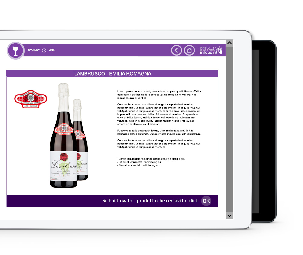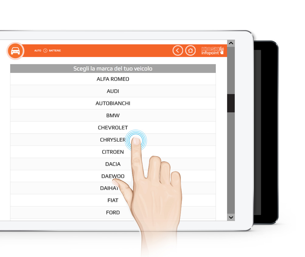 Kiosk Infopoint è la soluzione ideale per i tuoi clienti. Attraverso l’interfaccia intuitiva l’utente può avere una panoramica completa dei vostri prodotti e informazioni.